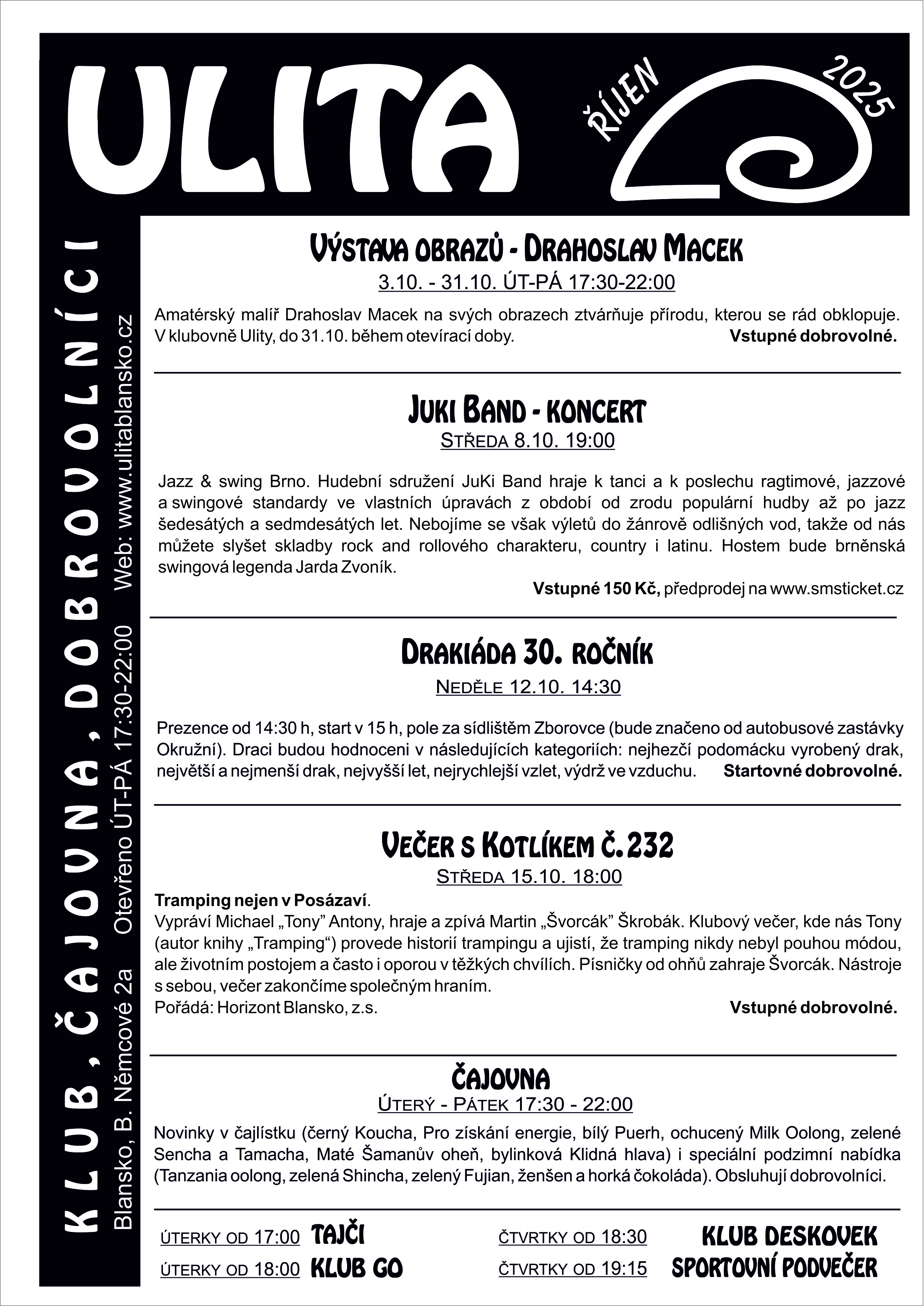 V říjnu si s Ulitou užijete výstavu obrazů Drahoslava Macka, swingový koncert brněnské kapely JuKi Band, tradiční Drakiádu nad Zborovci a další pořad z Cyklu Večer s Kotlíkem, tentokrát na téma Tramping nejen v Posázaví.