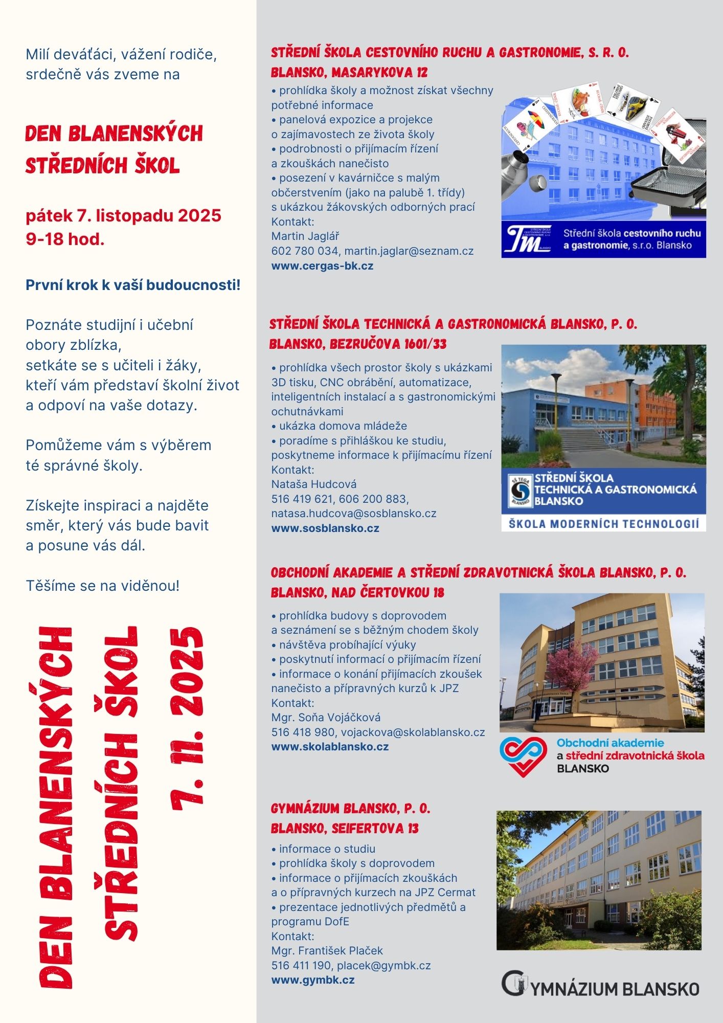 Stejně jako v předchozích letech nabízíme uchazečům a jejich rodičům jednak z blanenských ZŠ, ale především z mimoblanenských měst a obcí možnost návštěvy všech SŠ v Blansku ve stejném termínu (a absolvování více dnů otevřených dveří při jediné cestě do Blanska).