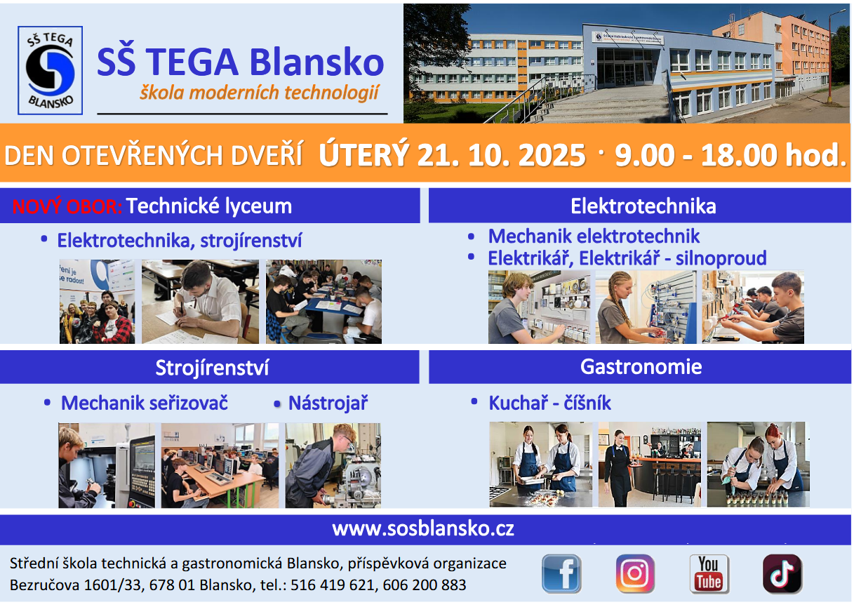 Srdečně zveme všechny zájemce o studium a jejich rodiče na Den otevřených dveří pořádaný naší SŠ TEGA Blansko. Těšit se můžete na prohlídku školy s průvodcem a na náš osobní přístup, kdy se každému návštěvníkovi snažíme maximálně věnovat. Přijďte se podívat, sami se přesvědčit a najít tak snáze cestu ke své profesní budoucnosti.