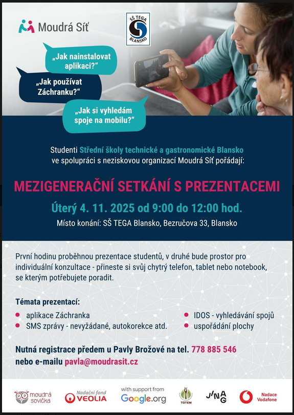 👋 Zveme vás na Mezigenerační setkání s prezentacemi, které pořádají studenti SŠ TEGA Blansko ve spolupráci s neziskovou organizací Moudrá Síť. Cílem setkání je pomoci seniorům bezpečně a zdarma ovládat moderní technologie – a zároveň propojit generace.