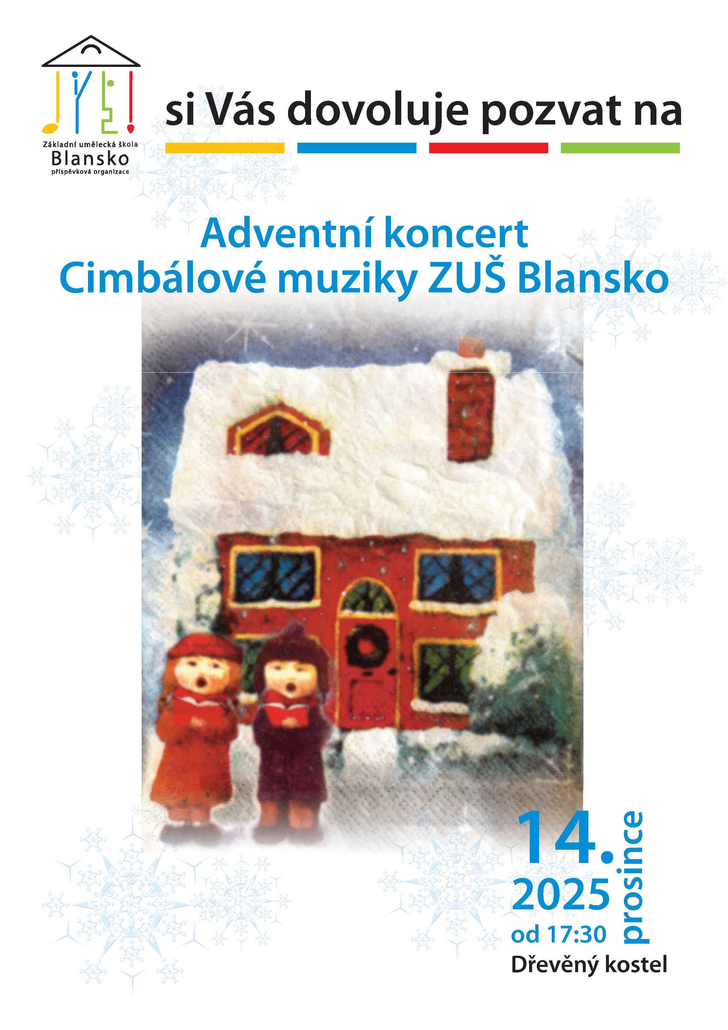 Srdečně vás zveme na jednu z nejkrásnějších prosincových tradic – adventní koncert, tentokrát naší Cimbálové muziky ZUŠ Blansko, který zazní 14. prosince v 17:30 v kouzelném prostředí dřevěného kostelíku v Blansku.