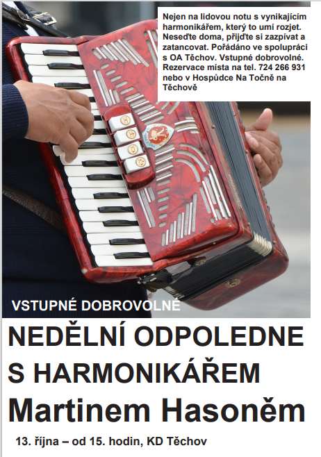 Přijďte si zazpívat, zatancovat nebo jen posedět s harmonikářem Martinem Hasoněm. Začátek v 15 hodin – vstupné dobrovolné